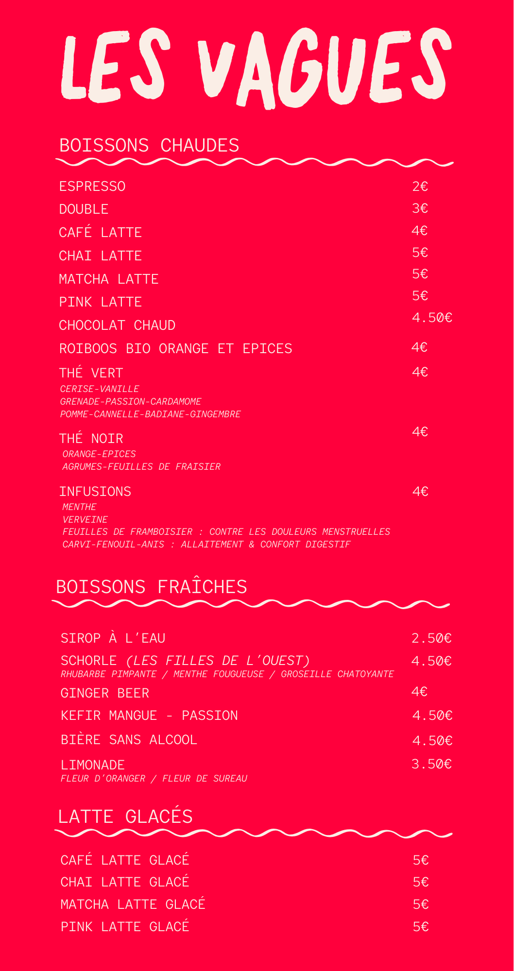 NOTRE MENU NOTRE COIN GOURMANDISES --------- COOKIES Préparés par les soins de la pâtisserie Singulière à Paris, avec des produits bio et français ! --------- €4 CHICO CHOCO Cookies au chocolat blanc et la chicorée €4 €4 CLASSIQUE Cookies au chocolat noir, avec une pointe de sel €4